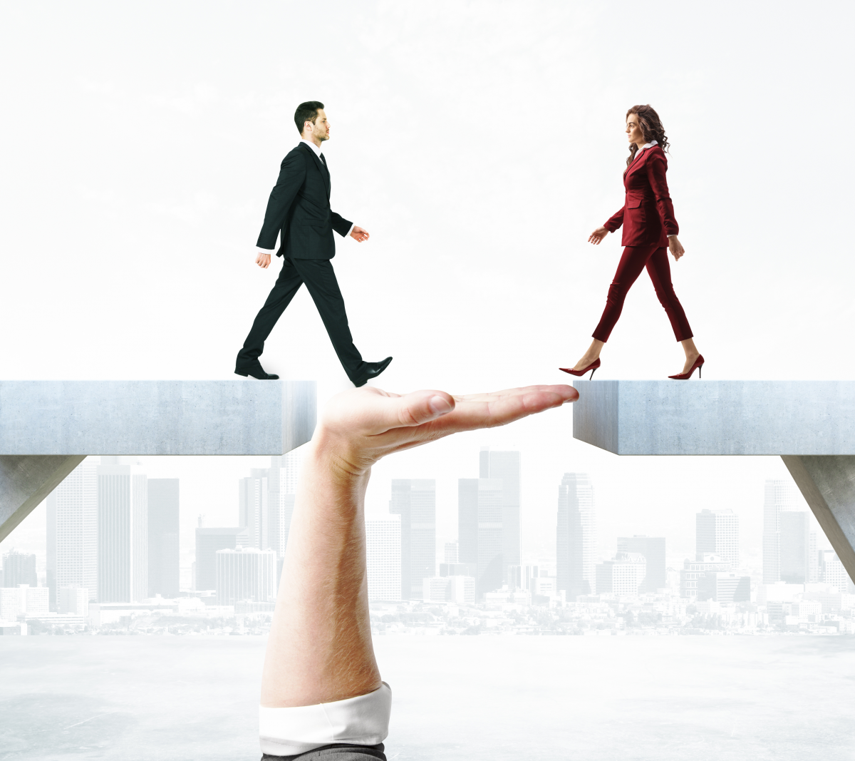 In the picture on the left, you see two people walking toward each other and toward an abyss that is spanned by a steady hand. The hand is there to provide a safe path. It is not tilted in any direction. It won’t let either person fall if they choose to stand on it. The hand is the neutral Mediator, enabling both people to walk with autonomy towards their destination.